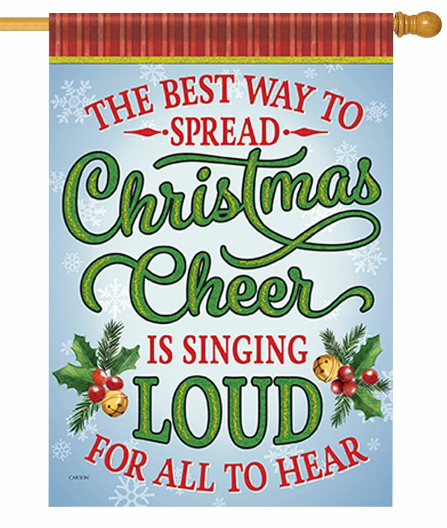 Who doesn’t recognize this famous line from one of your favorite Christmas movies? “The Best Way to Spread Christmas Cheer is Singing Loud for All to Hear”. What a fun house flag to display at your home or business. The wording reads correctly on both sides of the flag.