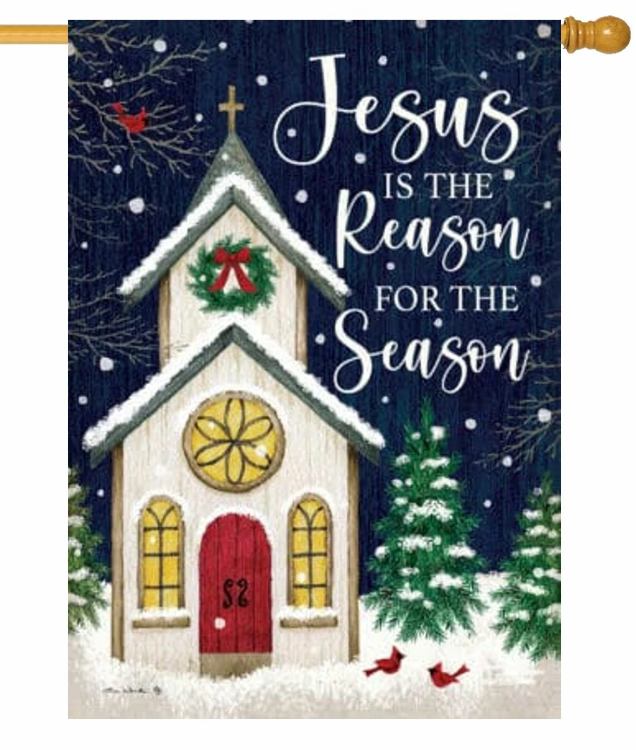 Nestled somewhere in the country is a small Christmas Church with welcoming red doors and amber glowing lights pouring from the windows. This beautiful house flag “Jesus is the Reason for the Season” shows the snow coming down with several red cardinals at play. This house flag would look amazing at your home, business, or church this Christmas season.