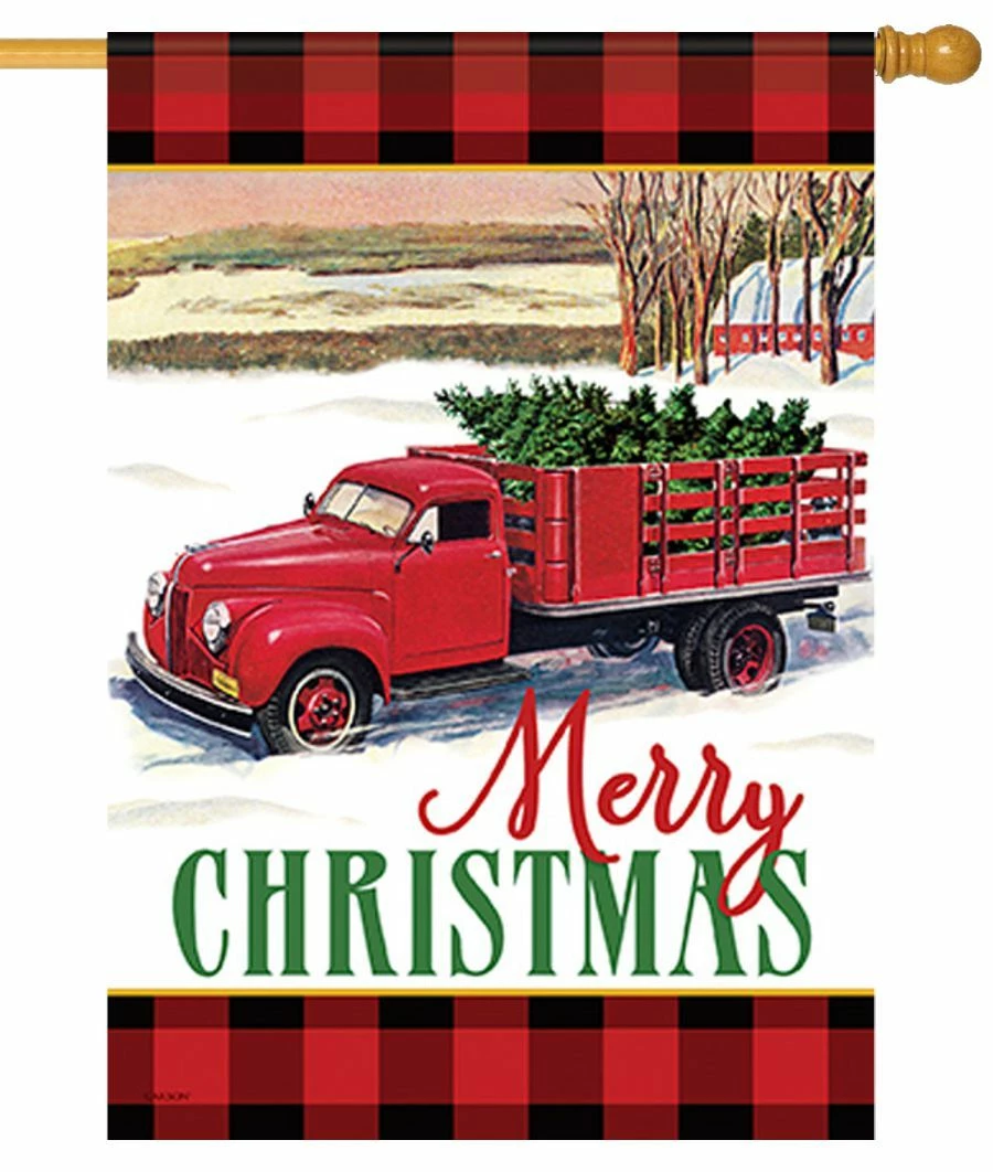 When you’re decorating for the Christmas holidays, this decorative house flag is the perfect way to celebrate the beauty of the season. The image shows an old vintage red truck with a Christmas tree in the bed. The truck is parked in the middle of a snowy field. Trees and a field are seen in the background. The message reads along the bottom, “Merry Christmas” in red and green script. Red and black buffalo plaid borders are on the top and bottom. This is a double-sided decorative house flag so the message and image read correctly from both sides. Share the peaceful scene and Christmas message on this decorative house flag with everyone who visits your home or business.