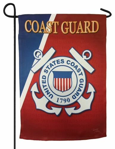 This US Coast Guard Garden Flag features a Coast Guard logo centered on a super cool-looking background that starts out dark red at the outside edges and graduates to a lighter red toward the center. The repeating words “UNITED STATES COAST GUARD” are watermarked into the background in dark red lettering becoming more visible toward the center as the background color becomes lighter. All lettering reads correctly from both sides.