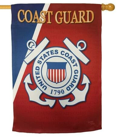 This US Coast Guard house flag features a Coast Guard logo centered on a super cool-looking background that starts out dark red at the outside edges and graduates to a lighter red toward the center. The repeating words “US COAST GUARD” are watermarked into the background in dark red lettering becoming more visible toward the center as the background color becomes lighter. All lettering reads correctly from both sides.