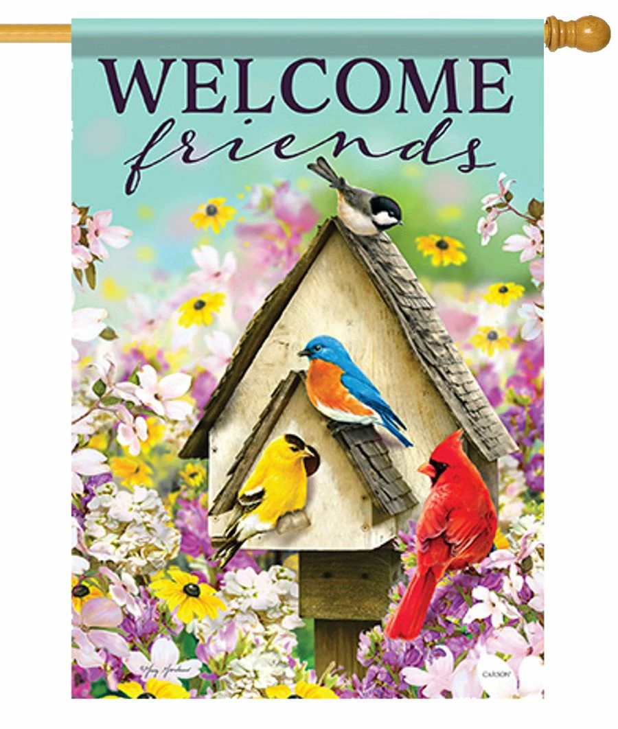 Display this ‘Welcome Friends” house flag depicting a gorgeous Spring day with a red bird, bluebird, black-capped chickadee, and a goldfinch enjoying the day outside of their birdhouse while surrounded by purple, yellow and white flowers in full bloom. This flag would look great in your garden, home, or business. The lettering is readable on both sides.