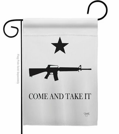 Come and Take It M4 rifle garden flag. This flag is inspired by the famous Gonzales โCome and Take Itโ flag from the 1835 war for Texas independence. The โCome and Take Itโ flag in its multiple modern-day incarnations is now widely recognized and used to represent the protection of our 2nd amendment right to keep and bear arms.