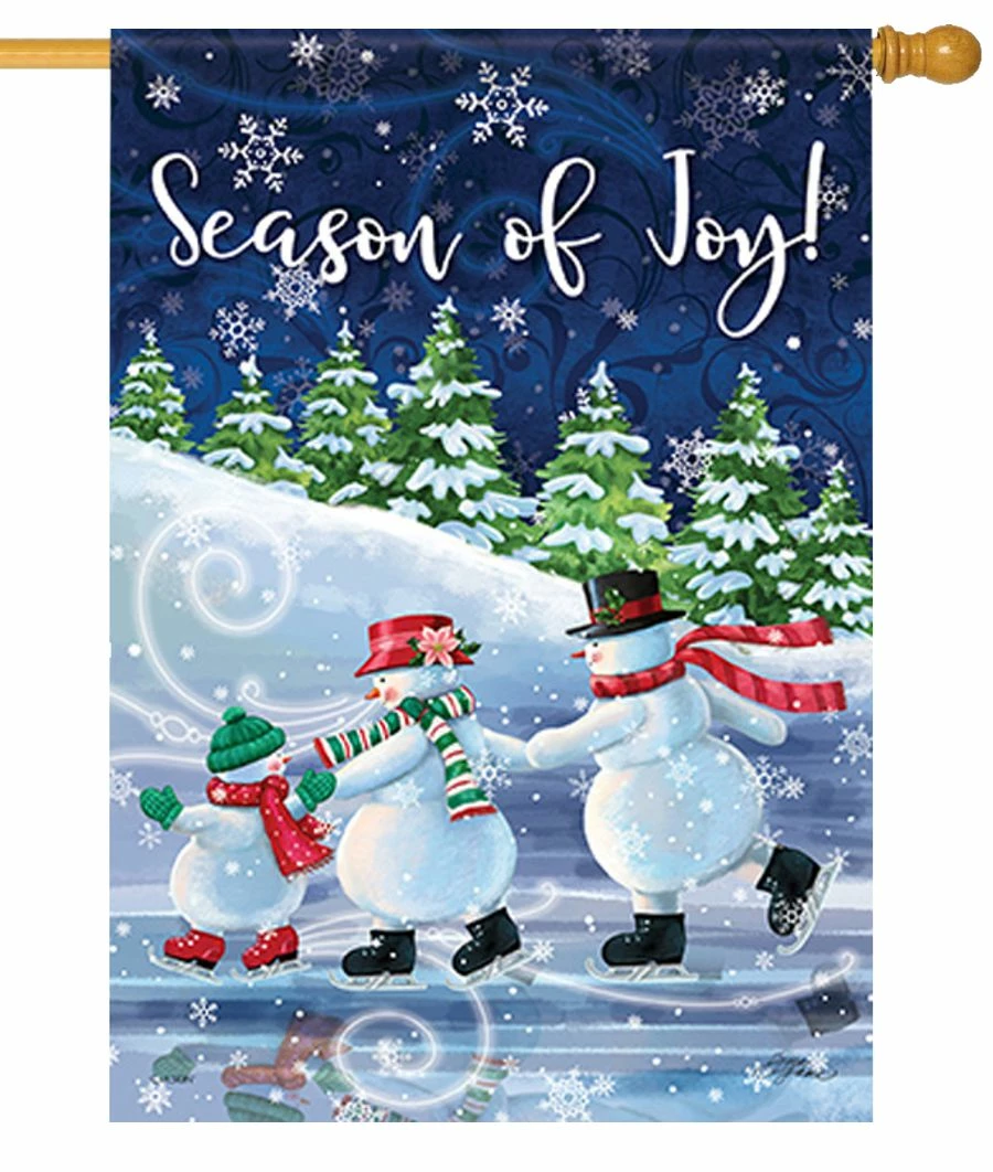 “Season of Joy” house flag depicts a cute snowman family who are out enjoying a day of ice skating together. Clad in decorative hats and scarfs in a wonderland themed freezing environment meant just for them. This house flag will look great at your home or business. The wording reads correctly on both sides of the flag.