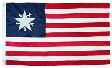 This is a reproduction of the flag or one of the flags that many historians believe may have flown over the ramparts of the Alamo during the 13-day siege of the Mission fortress February 23 – March 6th, 1836. A book was published in Philadelphia in 1837, shortly after Texas won her independence from Mexico entitled “Colonel Crockett’s Exploits and Adventures in Texas as Written by Himself” that was based on Crockett’s own writings. The book, in part, describes Crockett’s account of the last days of the Alamo. It is reported that a man named Charles Beale visited San Antonio a few days after the fall of the Alamo and came into possession of one of Crockett’s diaries. One excerpt, in particular, dated February 23, 1836 reads, “We have had a large national flag made. It is composed of thirteen stripes, red and white, alternating on a blue ground, with a large white star, of five points, in the center, and between the points the letters TEXAS.” There are some historians that dispute the authenticity of the Crockett journal, but variants of the flag are noted in other revolutionary journals in the days leading up to the battle of the Alamo. No one will ever know for certain what the flag or flags that flew over the Alamo during the battle looked like, but there is a significant amount of evidence that a flag closely resembling this reproduction was present at the Alamo during the heroic yet hopeless stand taken by the small group of Texians.
