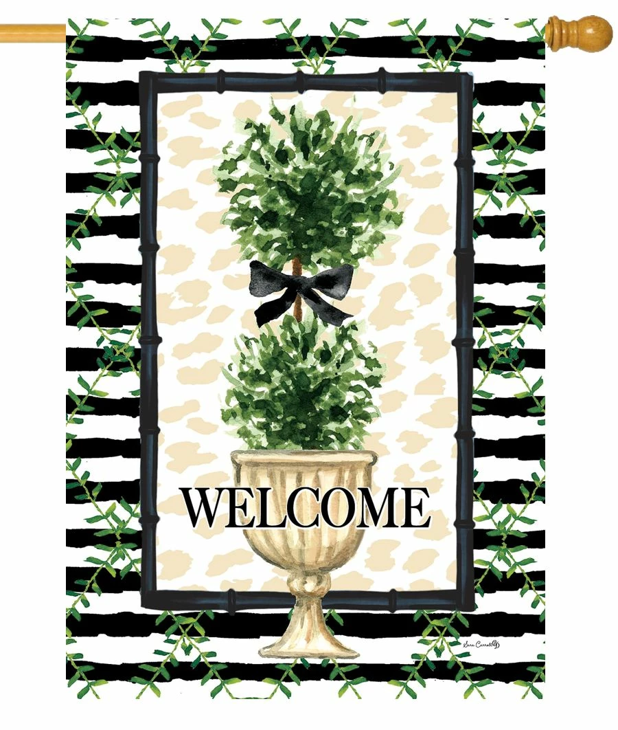 “Welcome” family and friends with this elegant Double Topiary House Flag. This is eye catching and will definitely stand out while displayed outside of your home or business. The wording reads correctly on both sides of the flag.