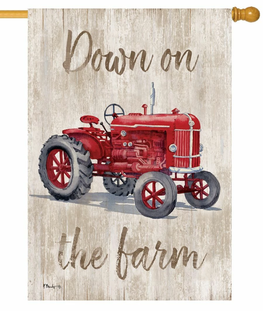 This antique red tractor themed decorative house flag shows an old, red tractor against a distressed, weathered background with a rustic “Down on the Farm” message that reads correctly from both sides of the flag. Add some country, farmhouse appeal to the outdoor or even indoor décor of your Home or business with this classic design. Artwork by Paul Brent.