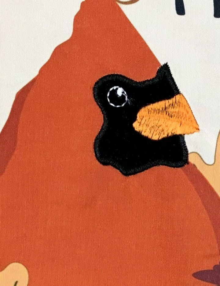 Enjoy your feathered friends this fall with this decorative house flag. The artwork shows three fall birds, cardinal, chickadee, and oriole, perching among a pile of fall leaves on top of a black and white tablecloth. The message reads across the top, “Friends Gather Here” in black lettering. The lettering reads correctly from both sides. This decorative house flag is a lovely decoration for the Thanksgiving and fall seasons.
