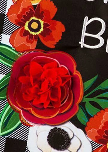 Share a beautiful sentiment this season with this decorative house flag. In a center black oval, the message reads, “Family is Life’s Greatest Blessing” in white lettering. The message is surrounded by red, yellow, white, and pink flowers. The background is black and white plaid. The lettering reads correctly from both sides. This is an elegant decorative house flag to welcome friends and family to your home.