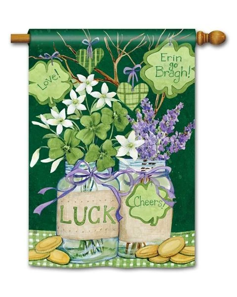 Display this country-style house flag for St. Patrick’s day with its rustic, farmhouse flavored elements and fun, fashionable patterns and traditional Irish words of encouragement displayed on the hanging shamrocks. Made for outdoor display, but attractive enough to hang up inside as well.