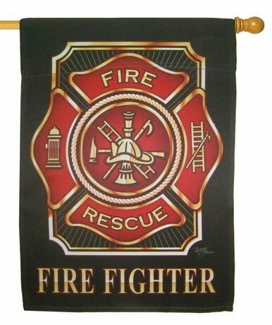 This great looking firefighter house flag features a Maltese cross logo against a jet black background that makes the red and gold fire and rescue emblem stand out beautifully. All lettering reads correctly from both sides.