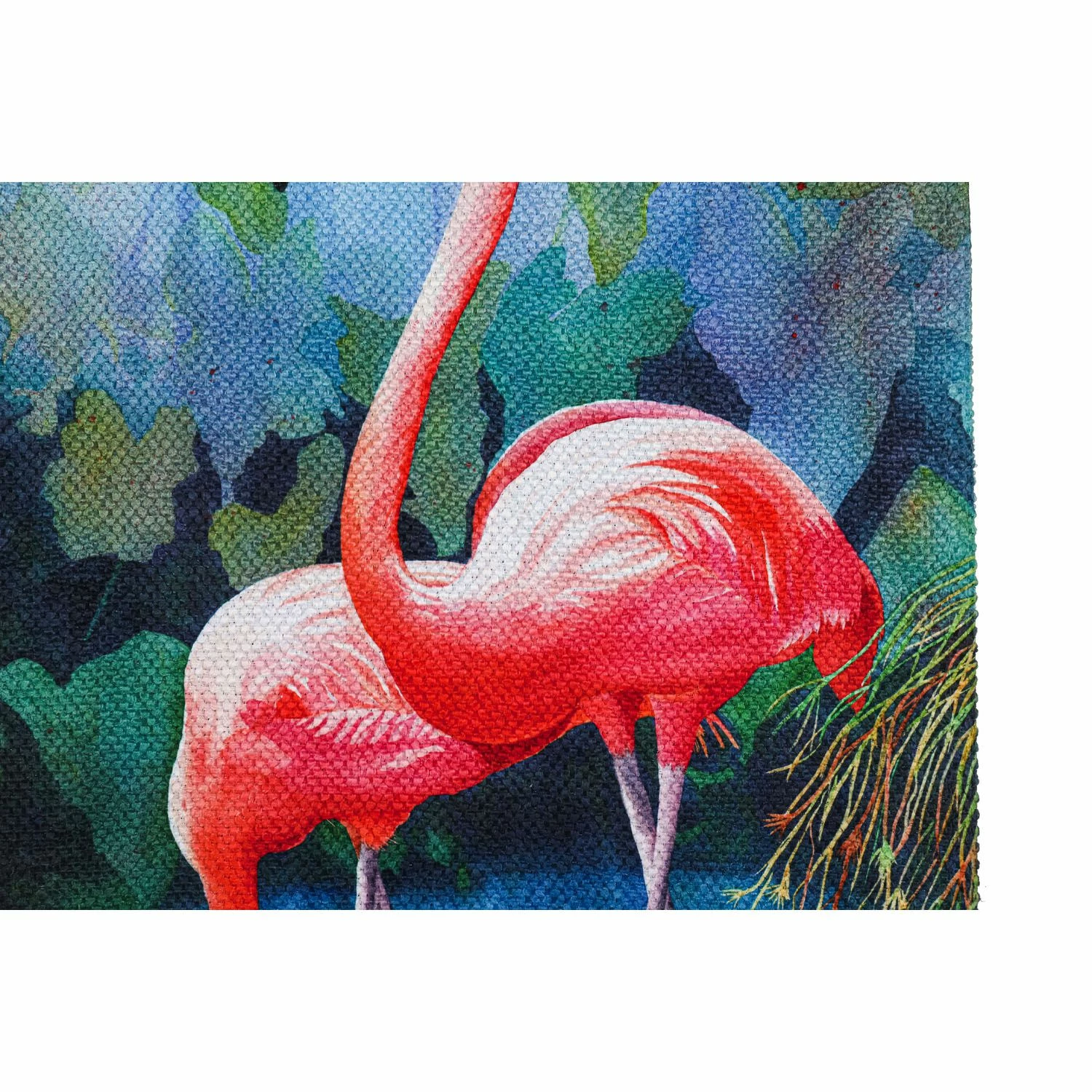 Pink flamingo house flag with lovely shades of blue water and green foliage surrounding a perfect pair of flamingos wading in the shallow water. Add bit of elegant flair to your Home décor with this artistic and gorgeous design.