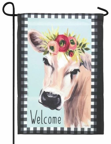 The beautiful, big dark-eyed cow depicted on this decorative garden flag is wearing a crown of soft, fresh flowers against a light, clear, blue-sky background. The “Welcome” lettering reads correctly from both sides of the flag while the fashionable, black, and white border adds the perfect final touch. Decorate your Home or business with this lovely farmhouse style design.