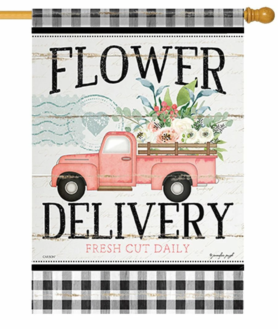 Your love of fresh flowers will always be on display with this decorative house flag. The image shows a vintage truck against a beige background. The bed of the truck is filled with flowers. A light blue motif of a postal stamp with a heart is seen in the background. Black and white checked borders run across the top and bottom of the flag. The message reads across the top, “Flower”. The message continues on the bottom, “Delivery”. Underneath is a small message in pink lettering, “Fresh Cut Daily”. The lettering reads correctly from both sides. The country charm of this decorative house flag makes it perfect for all of your decorating needs.
