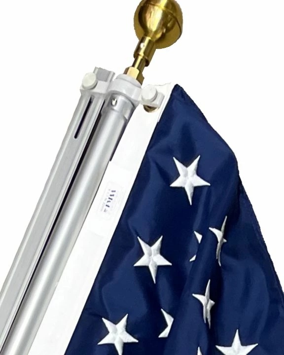 American flag, pole, and bracket kit including 6′ aluminum tangle-free flagpole, matching aluminum bracket that holds the pole at a 45-degree angle, and a beautifully sewn nylon American flag with embroidered stars and sewn stripes. All components are made in America. The specially designed counter-weighted mounting bar is equipped with two threaded knobs making it easy to attach and replace the flag. The mounting bar rotates freely on the pole using two Delrin bearings. Delrin is also known as Poly Oxy Methylene (POM) which is a very hard yet smooth (almost slippery) plastic product that wears extremely well allowing the mounting bar to easily and quietly rotate 360 degrees on the one-piece pole thus preventing the flag from wrapping around the pole.