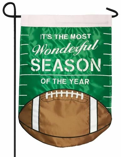Celebrate football season this year and display the clever, cool-looking decorative garden flag that shows a green field with “It’s the Most Wonderful Season of the Year” embroidered on both sides of the flag, so the lettering reads correctly on both sides. Football fans of every stripe can enjoy this great-looking flag for the whole season long. Made for outdoors, but looks “Wonderful” inside as well.
