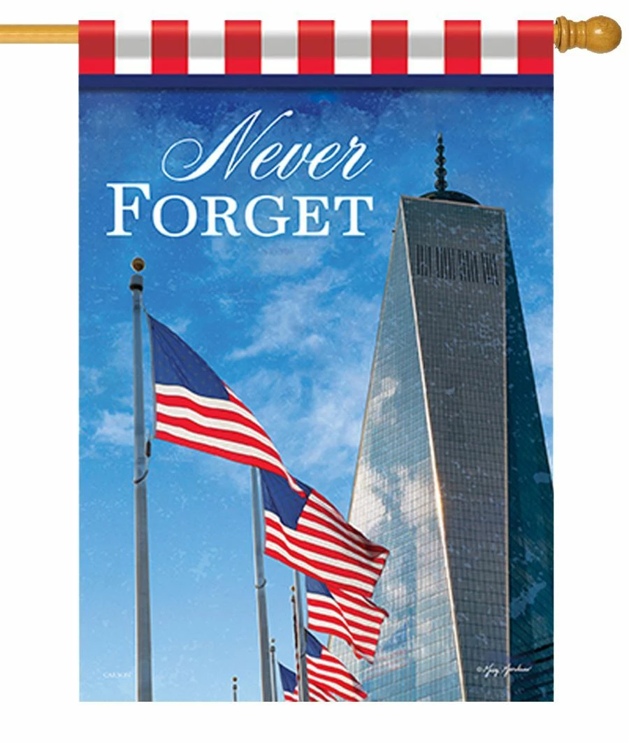 The tragedy of 911 is forever captured in this decorative house flag that urges everyone to remember the loss experienced on that day. The image shows the Freedom Tower standing tall and surrounded by American flags. The red, white, and blue theme captures the indomitable spirit of America. The lettering reads correctly from both sides. As this decorative house flag shows, from tragedy Americans can rise again.
