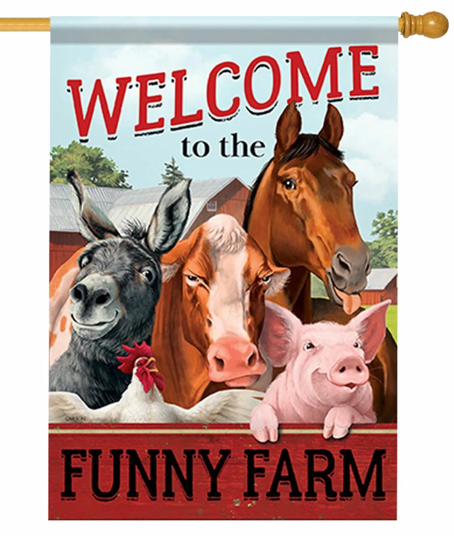 This humorous farmyard-themed house flag features a hilarious welcoming party consisting of a horse, cow, donkey, pig, and chicken all smiling and ready to greet visitors to the Funny Farm. The artwork appears on both sides and the “Welcome to the Funny Farm” message reads right on both sides of the flag as well.