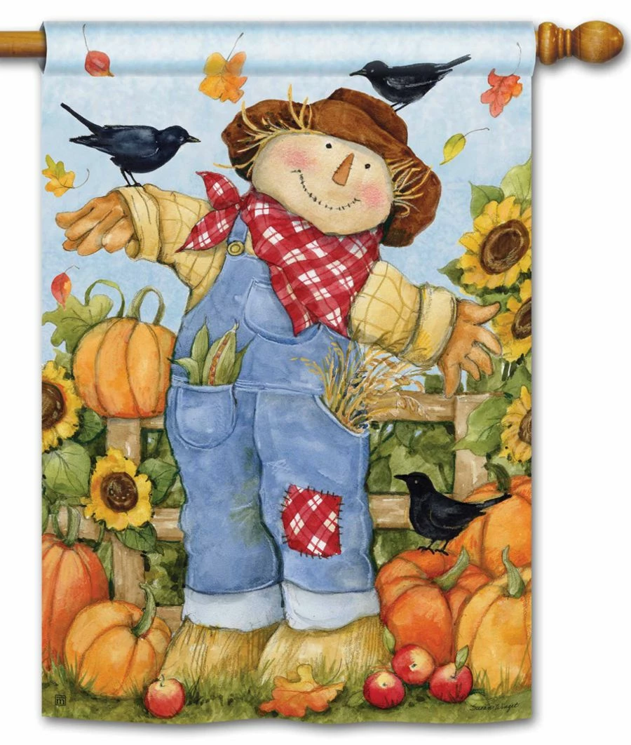 This autumn-themed house flag features a super cute scarecrow standing in the pumpkin patch while friendly black crows are hanging out, perched all around waiting for the scarecrow to share the ears of corn stuck in his overalls pocket. pumpkins, sunflowers, and falling leaves all come together for the perfect autumn scene. The artwork is visible on both sides of the flag.