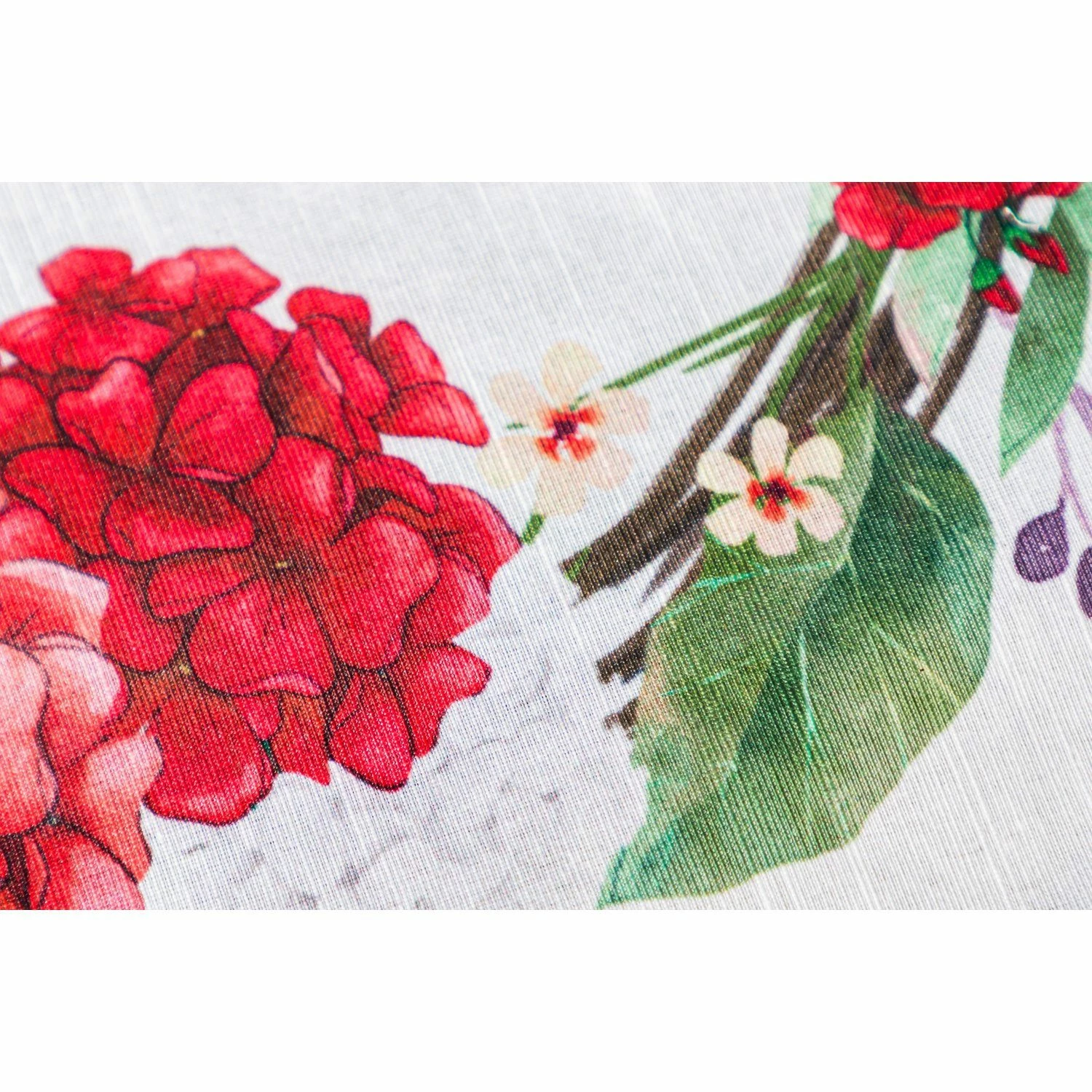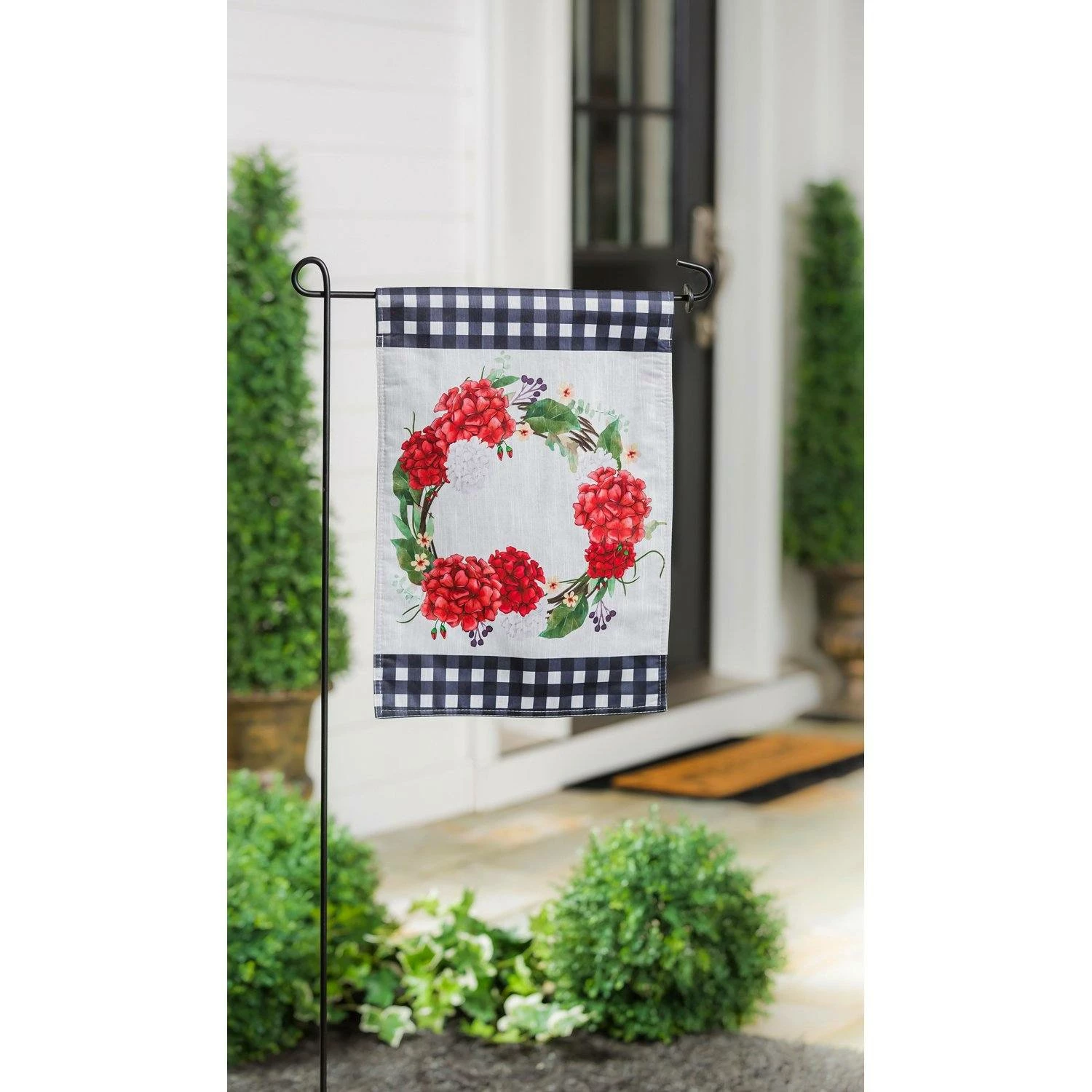 Add a bit of sophisticated, floral flair to your spring and/or summertime decor this year by displaying this geranium wreath garden flag with its whitewashed background with black and white plaid borders across the top and bottom of the design. This flag will add a splendid touch of class to almost any outdoor space and is also suitable to display indoors.