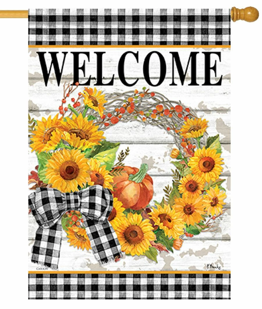 This fall decorate your home or office with this cheerful decorative house flag. A large wreath decorated with bright yellow sunflowers and a pumpkin is shown. The wreath is also decorated with a large black and white bow. The wreath appears to be hanging on a white, clapboard wall in the background giving the flag a rustic look. The message reads, “Welcome” in black letters above the wreath. Black and white checked borders run across the top and bottom with gold colored trim. This is a double-sided decorative house flag so the message and image read correctly from both sides. This decorative house flag makes a cheery addition to your fall decorating.