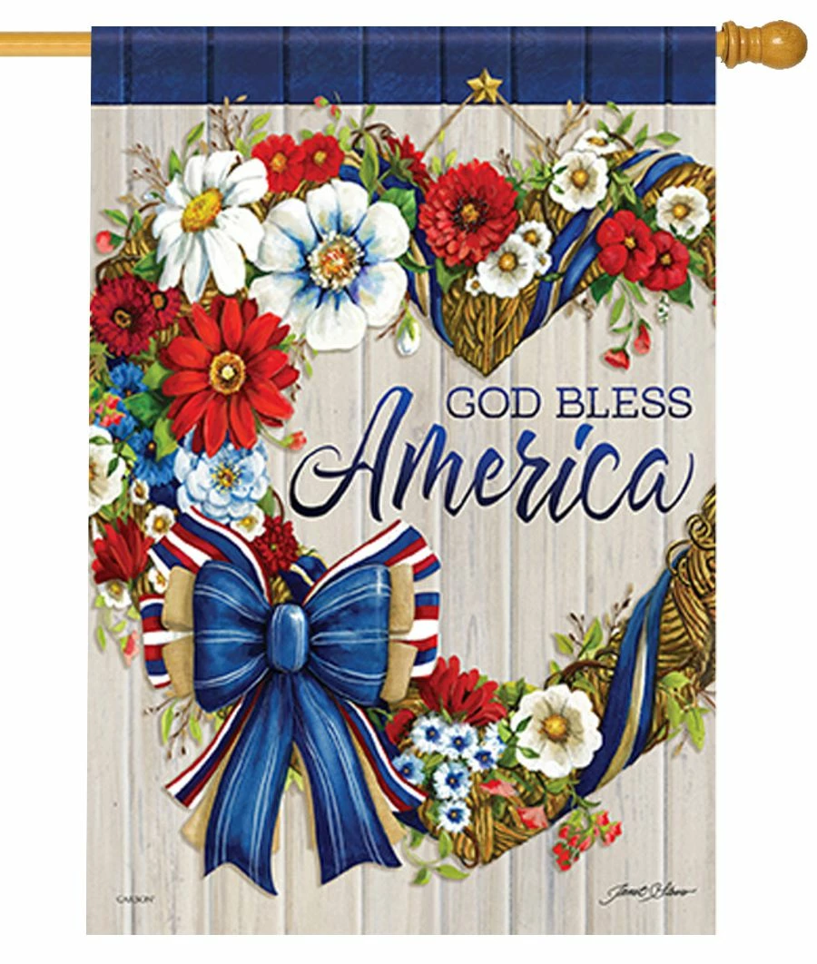 This Americana patriotic-themed house flag shows a beautiful red, white, and blue floral wreath that is shaped like a heart and finished with a bright blue bow all against a whitewashed wood background. The artwork is visible on both sides of the flag and the “God Bless America” lettering reads right on both sides as well.