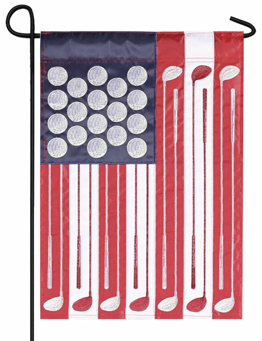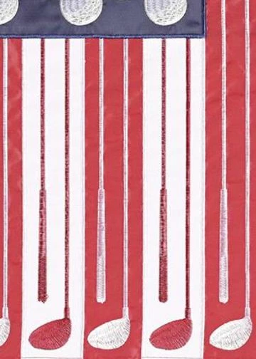 Celebrate America’s love of golf in patriotic fashion with this club and balls Americana-themed double applique garden flag. The clubs are arranged in the stripe pattern while the balls represent the stars of an American flag. All of the details are appliqued, embroidered, and fully sewn, and appear on both sides. This flag will add a real hole in one to your outdoor or even indoor patriotic sports-related decor.