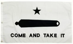 The famous Come and Take It Gonzales flag was painted by Cynthia Burns and Evaline DeWitt on a cotton cloth and flown at Gonzales Texas in late September 1835 which was the site of the first battle in the Texas war for independence from Mexico. Because of concerns about a Texas rebellion, Mexican troops were sent to recover a cannon that had been given to the town to fight off occasional Indian attacks. In a display of defiance, the Texans, refusing to be disarmed, fired on the Mexican troops, compelling them to withdraw. The Gonzales flag has become a popular symbol of Second Amendment rights nationwide and other variations of the design have since been created.