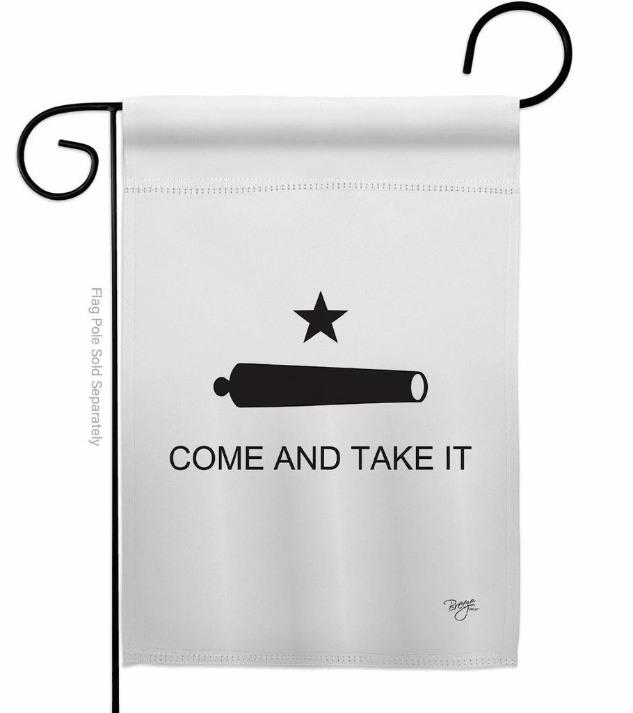 Dress up your Home, or business with a bit of Texas Independence era flair and hang this “Come and Take It” garden flag. This configuration of the Gonzales flag is designed to be mounted on the same type of flag stand as a decorative or seasonal garden flag.