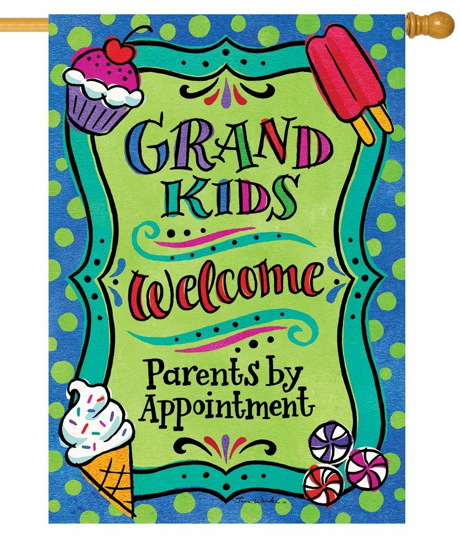 Let your grandkids know whose boss with this decorative garden flag. The message reads, “Grandkids welcome Parents by appointment” in colorful, playful lettering against a green background. The blue border has green polka dots. Each corner of the message is framed with a fun treat like ice cream, popsicles, lollipops, and cupcakes. The message reads correctly from both sides. This decorative garden flag is a fun way to welcome the little (or big) ones when they come to visit. Artwork by Tina Wenke.