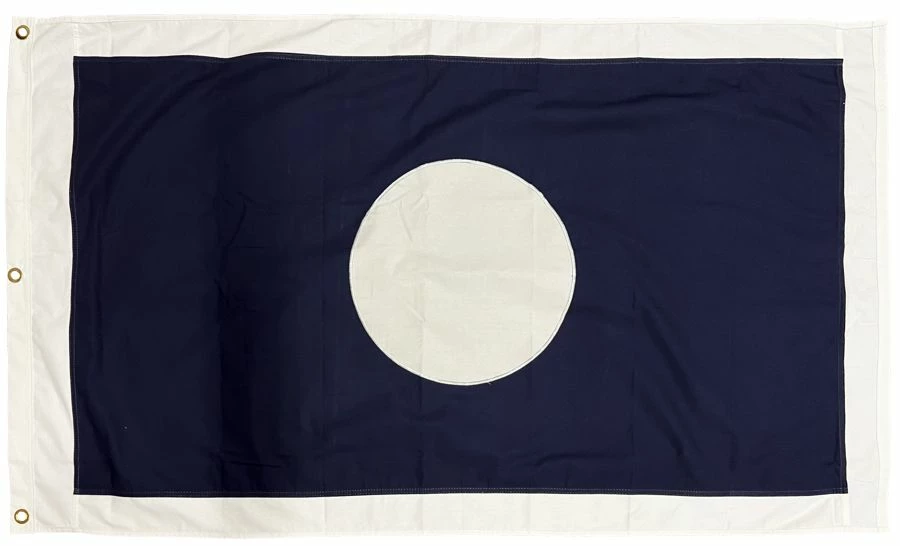 Cotton flags feature a very heavy, luxurious look and feel. They are commonly used indoors because of their old-world, handcrafted appearance but can also be flown outside, although they are not very durable or fade-resistant with prolonged exposure to the outdoor elements. Cotton flags are also suitable for tea staining and/or framing and hanging indoors. The moon/disc is appliqued and beautifully outlined with a heavy bead of embroidery.