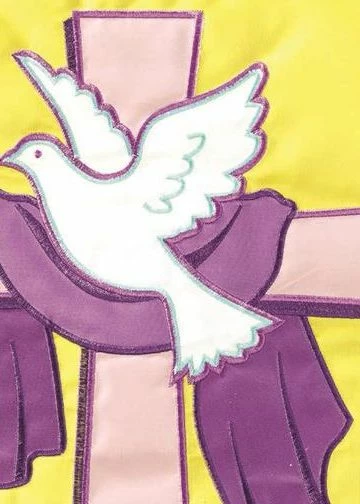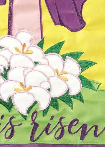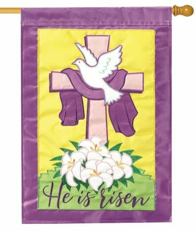 “He Is Risen” features a white dove in front of the cross with Easter Lilies at the base. This beautiful double applique house flag would be great for Easter services at your church, or in front of your home. Readable on both sides. Close-up photos are available for more details.