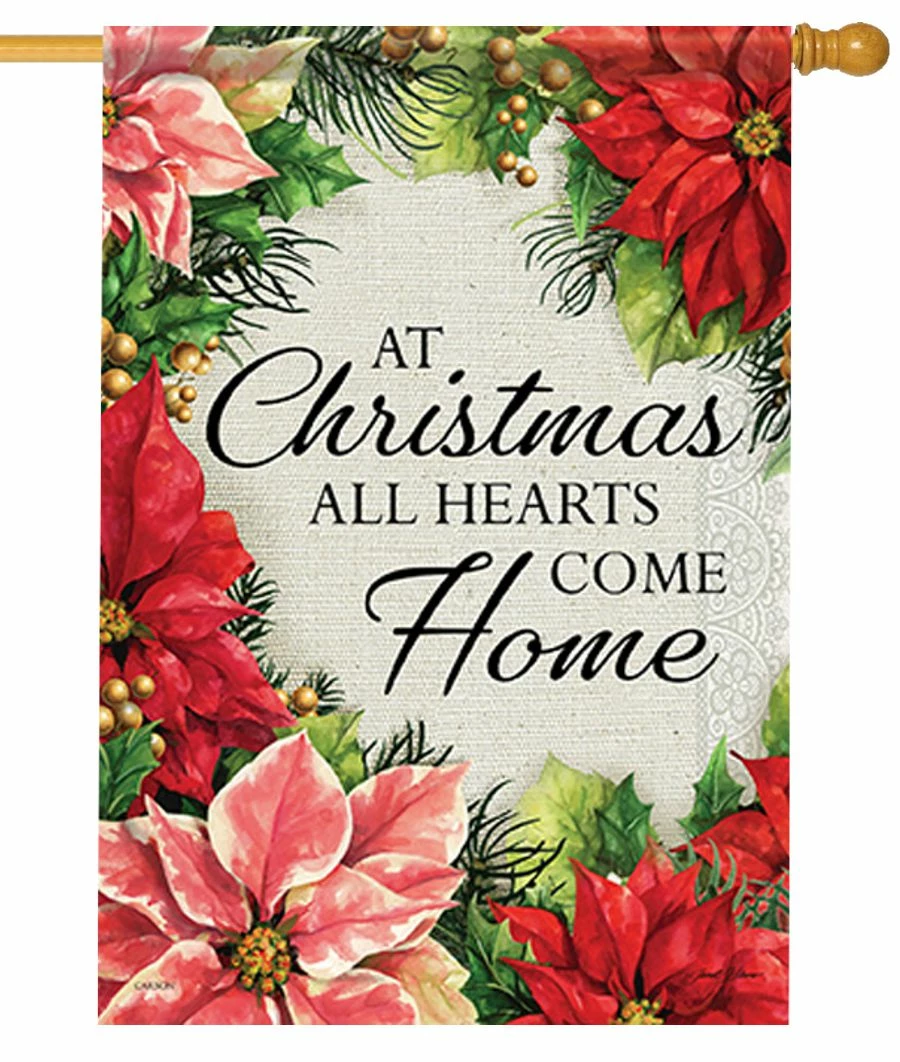 “At Christmas All Hearts Come Home” is a beautiful sentiment surrounded by various colors of pinks and red poinsettias in a wreath. Having everyone home for the holiday season is such a warm feeling. This lovely house flag could be displayed outside of your home, work or at church. The lettering is correct on both sides of the flag.