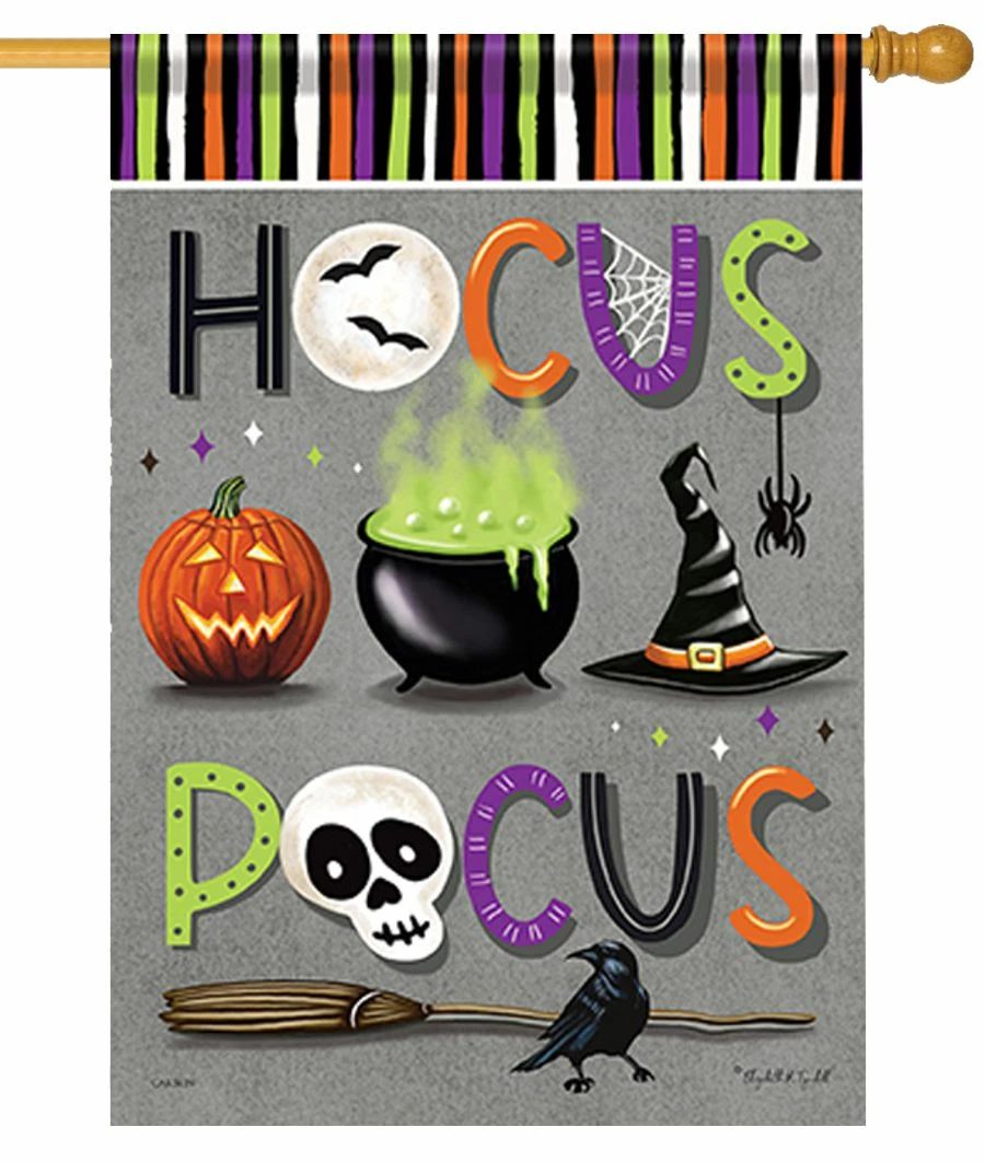 Multi-colored and full of fright is this spooktacular house flag. “Hocus Pocus” has spiders, bats and a big black crow! It will look outstanding outside of your home or business under a full moon. The letters are correct on both sides of the flag.