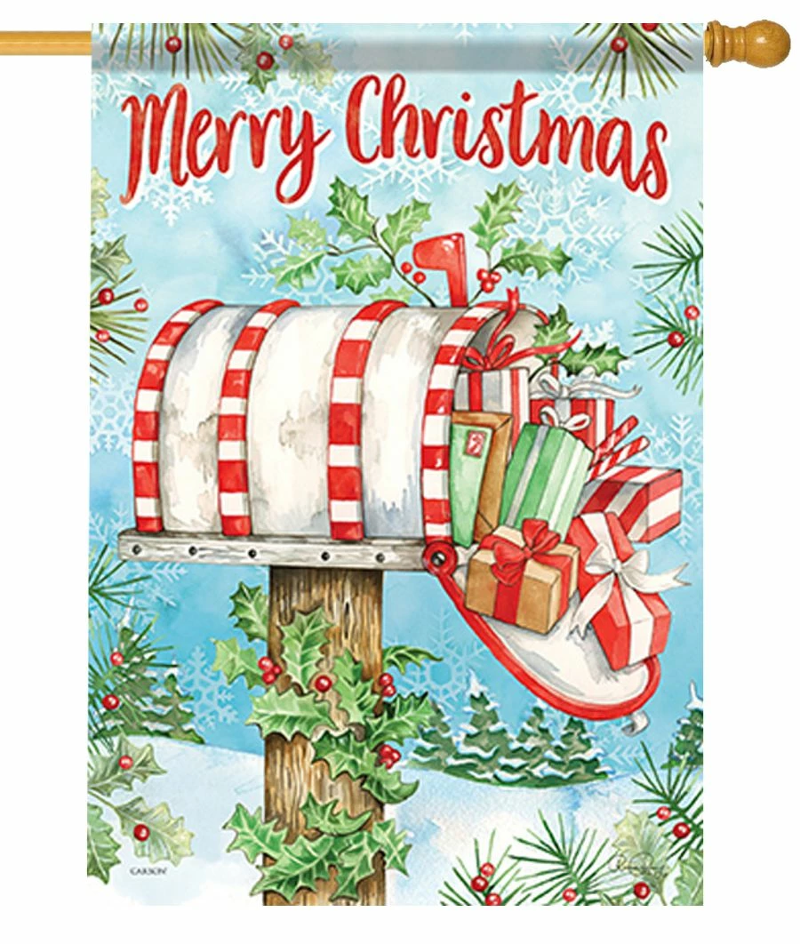 ” Merry Christmas” with this delightful rural mailbox house flag. It’s stuffed with joy! Beautifully decorated with holly and berries as well as peppermint stripes, this fun flag will definitely stand out at your home or business. The wording reads correctly on both sides of the flag.