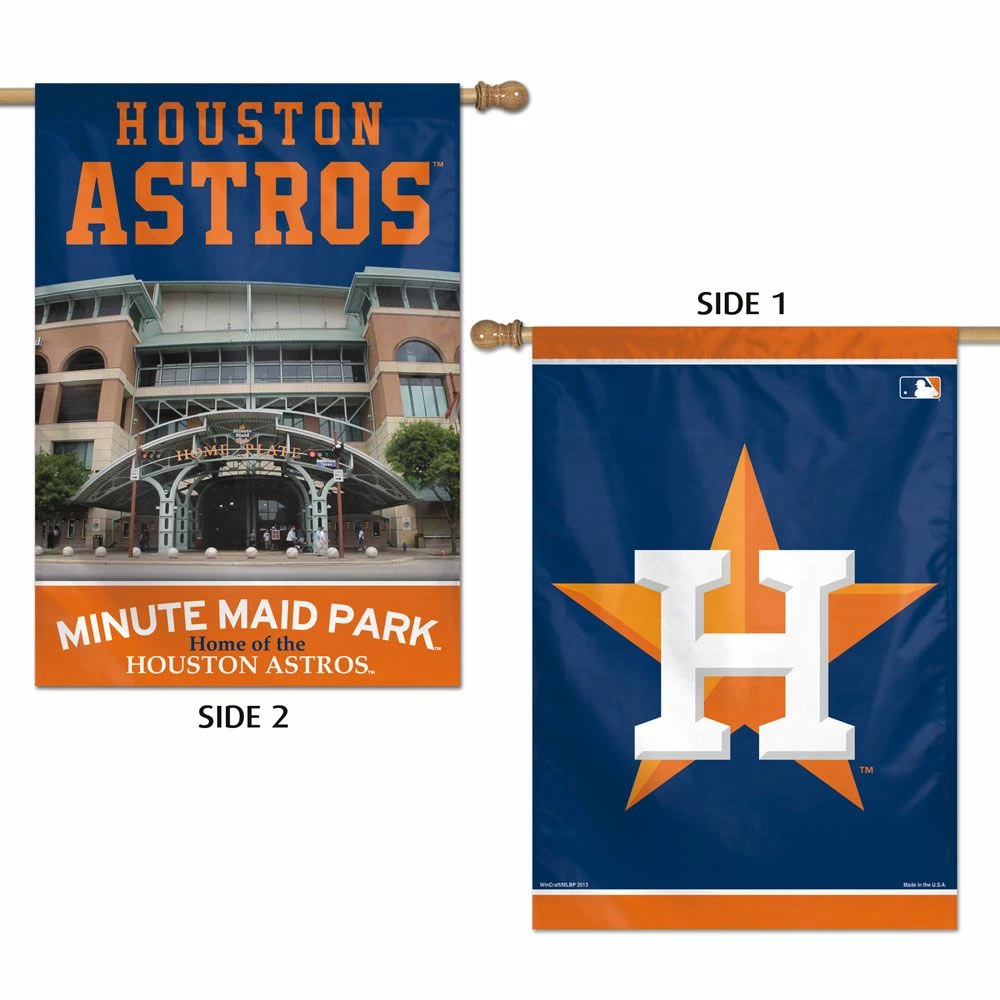 MLB officially licensed Houston Astros logoed, decorative house flag, featuring two different images on either side of the flag. The official H-Star logo is on one side while a very sharp-looking photo of Minute Maid Park appears on the opposite side. Hang this cool-looking flag up for gameday or every day to show your support for The Astros.