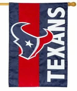 Show your support for the Houston Texans by flying this beautifully crafted, double sided, applique house flag on game day or every day. The lettering reads correctly from both sides of the flag and the embroidered, Texan logo is sewn onto both sides as well. Makes a great gift for your favorite Texans fan!