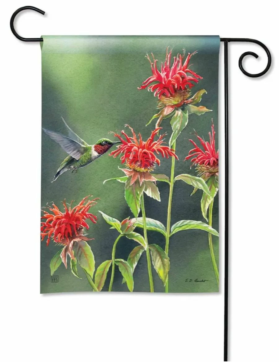 This hummingbird floral-themed garden flag features a stunning scene of a hummingbird hovering around tall standing red flowers. The rich red and green shades come together to create a strikingly beautiful contrast. The artwork is visible on both sides of the flag.