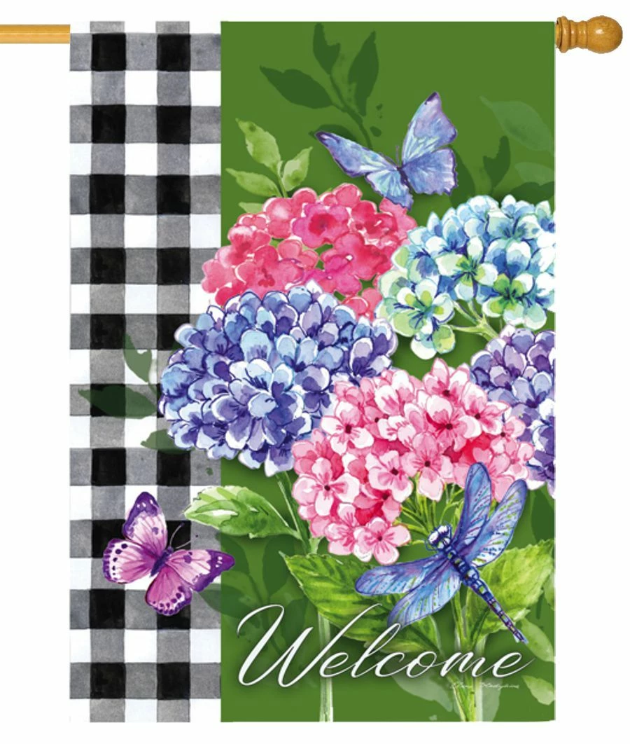 The beautiful floral image on this decorative house flag makes it a perfect decoration for your front garden. The image shows pink and blue hydrangeas. A vertical black and white checked border runs along the left side. The message along the bottom reads, “Welcome” in a light-colored script. The lettering reads correctly from both sides. Welcome your visitors with this decorative house flag.