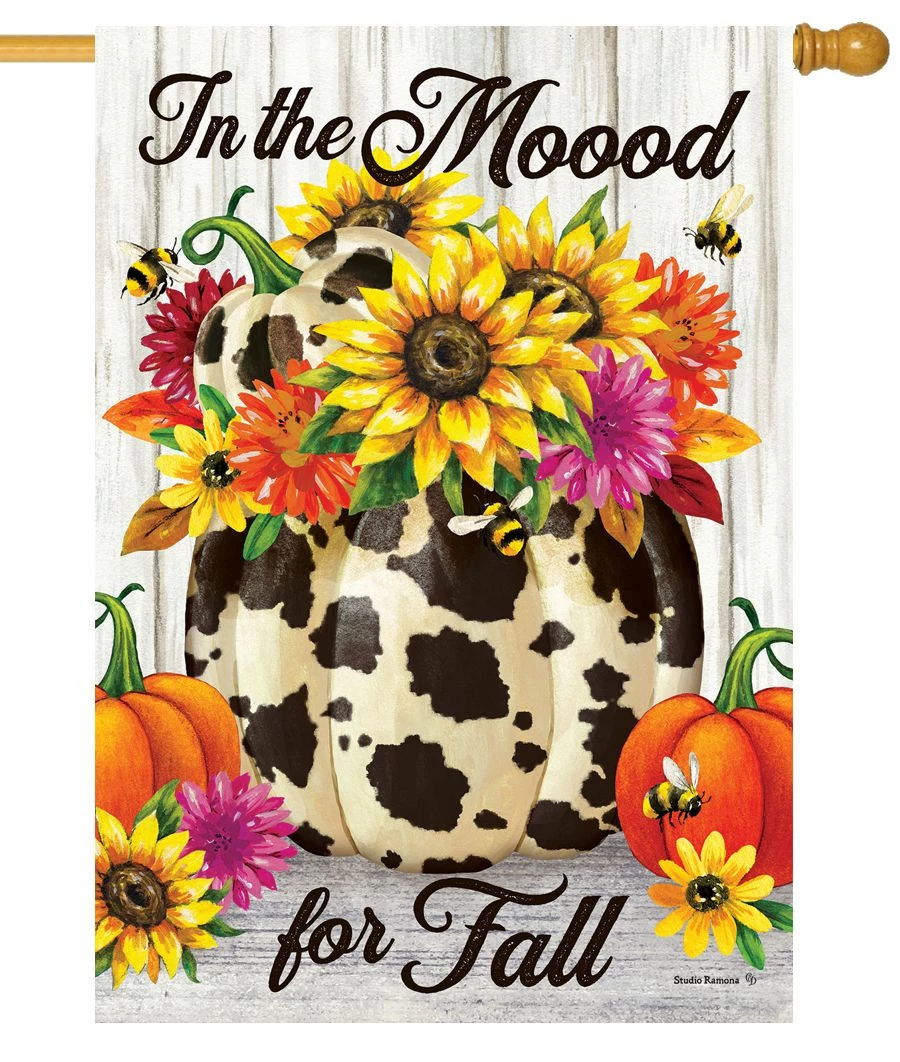 “In The Moood For Fall” is a fun and bright house flag with its cowhide pumpkin overflowing with a beautiful fall bouquet of sunflowers and gerbera daisies surrounded by bees. This fall flag would look great at your home or business.