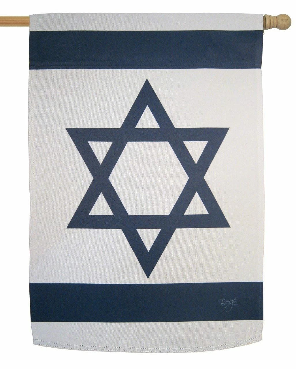 Israel-themed house flag featuring a blue star of David with upper and lower borders configured vertically and designed to be hung on a wall-mounted flagpole. Can be displayed at a 90-degree or 45-degree angle.