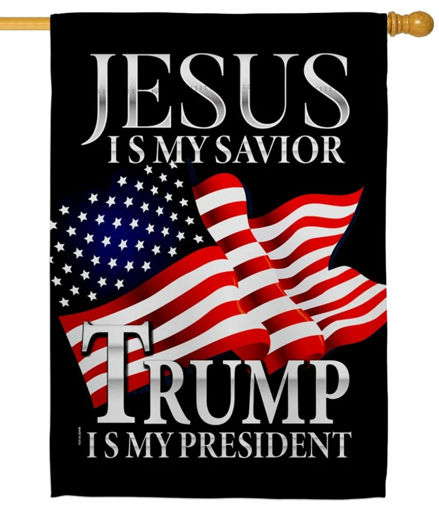 This Trump patriotic house flag features a waving American flag against a jet-black background and silver, shaded lettering that appears to be reflective and metallic and stands out beautifully against the black background. The lettering reads “Jesus is my Savior Trump is my President” and is readable from both sides of the flag.