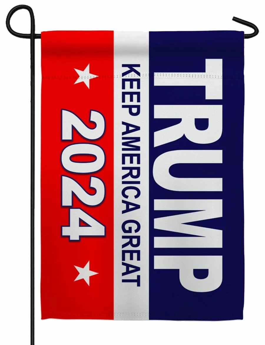 This red, white, and blue Garden Flag is sure to make a statement at any home or business. “Trump”, “Keep America Great”, “2024”. Readable on both sides.