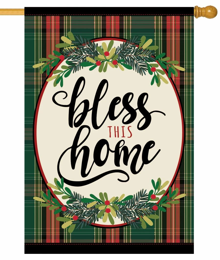 Share your love of your home and family with this decorative house flag. The message reads in the center, “Bless this Home” in black script on a white oval placard. Boughs of pines, foliage and berries are above and below the message. The edges of the flag are a dark red and green plaid. The lettering reads correctly from both sides. This is a traditional decorative house flag that will be a beautiful addition to your decor.