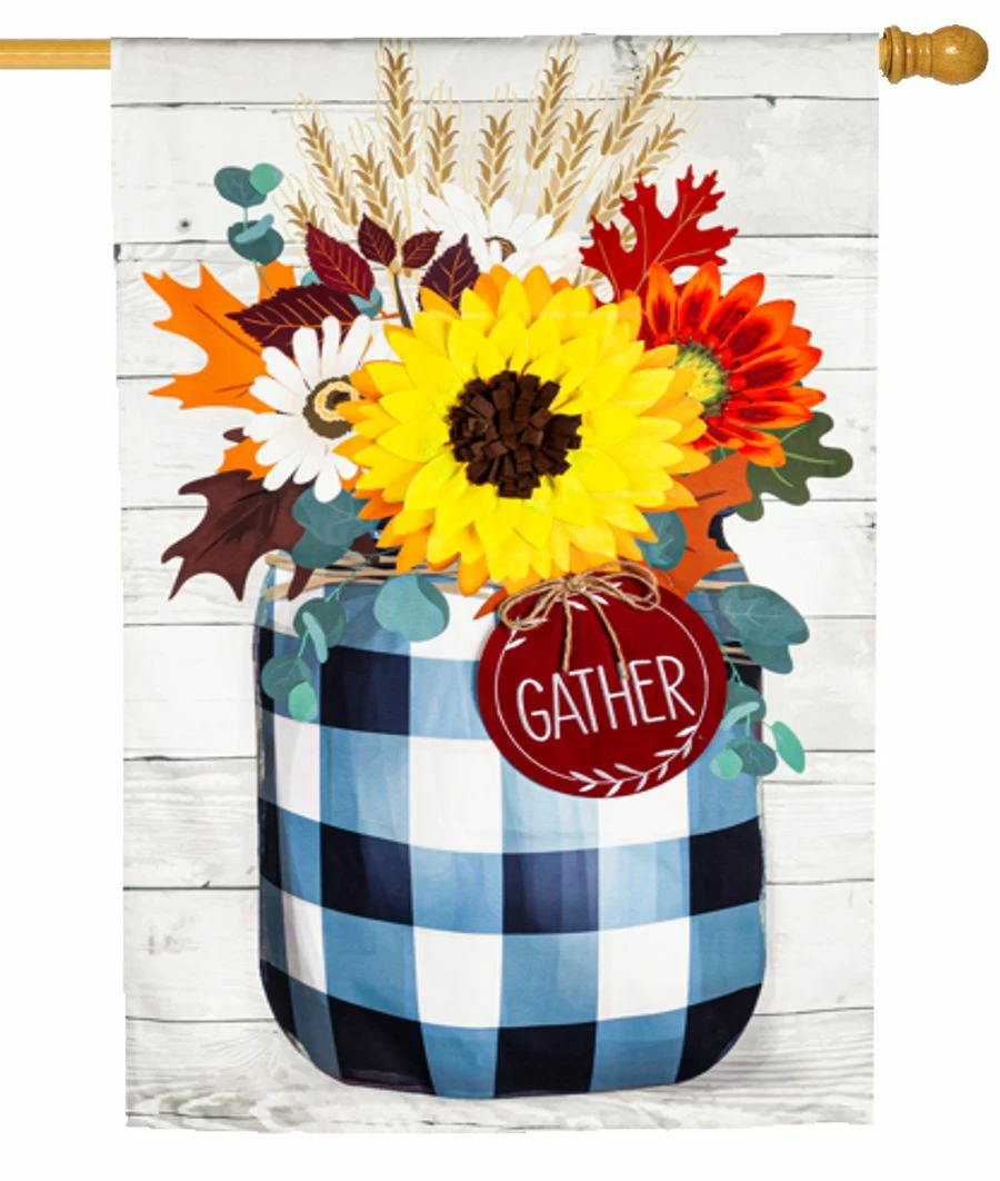 Enjoy this beautiful fall foliage bouquet set inside a decorative blue and white check-wrapped mason jar. “Gather” your loved ones this fall and decorate your yard with this beautiful house flag while enjoying hot cocoa and making smores. The lettering is correct on both sides.