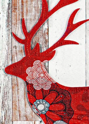 “Tis The Season” for displaying this beautiful three-dimensional flowered red deer house flag. Based on a wood-grained background with a green and red check top and bottom border, this is sure to get noticed at either your home or business. The wording reads correctly on both sides of the flag.