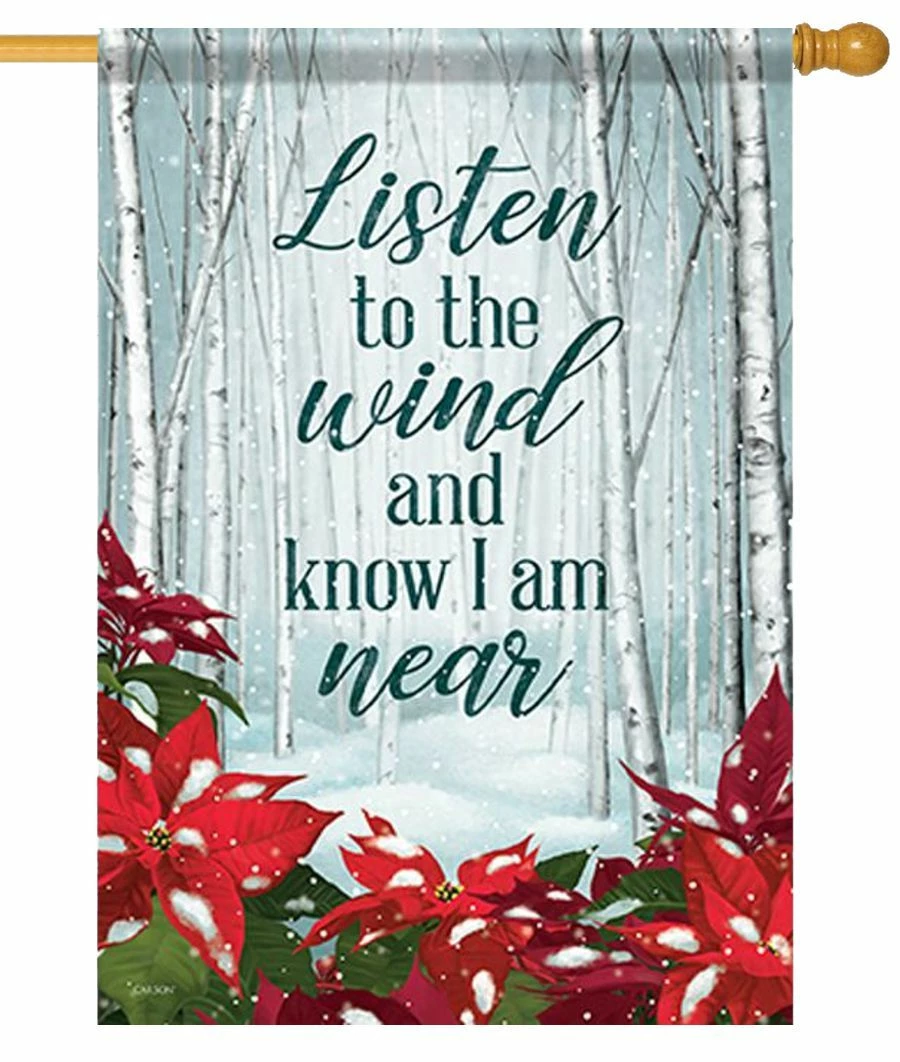 Decorate for Christmas with this timely message on this decorative house flag. The artwork shows a peaceful woodland scene of Aspen trees in the snow. The foreground is filled with bright red poinsettias. The message in the center reads, “Listen to the wind and Know that I am near” in dark grey lettering and script. The message and image read correctly from both sides. This decorative house flag delivers a peaceful and timely message for the Christmas season.