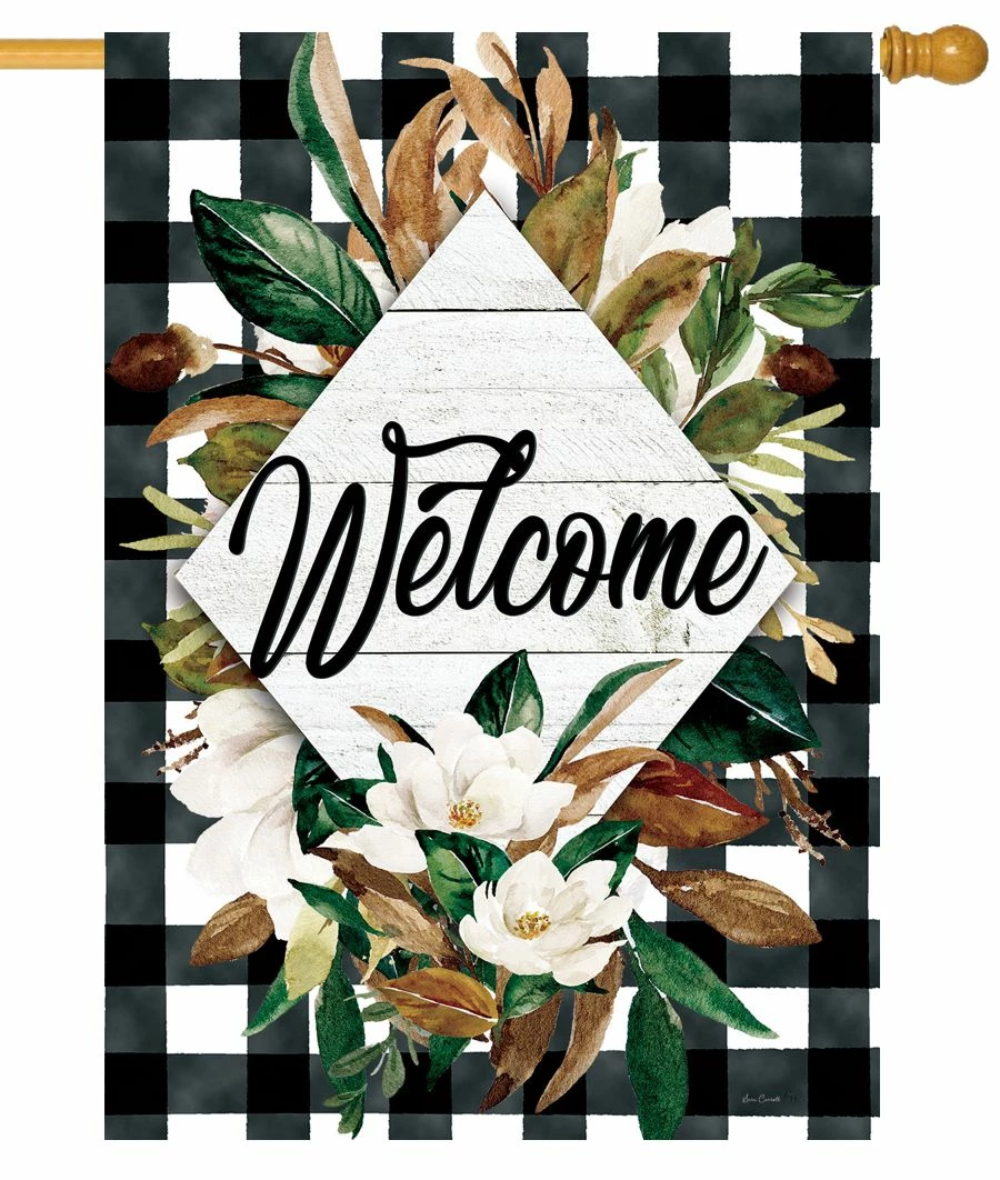 The state flower of Mississippi. There are some smells you never forget and the magnolia is one of them. “Welcome” your guests to your home or your office with this elegant house flag. This black and white check with a large bouquet of magnolias is sure to stand out. Readable on both sides. Artist Sara Carroll.