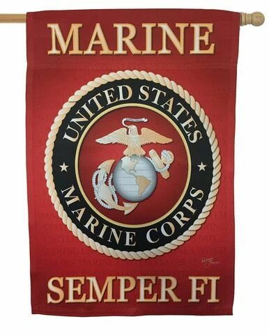 This United States Marine Corps, Semper Fi, house flag features an eagle, globe, and anchor seal centered on a super cool-looking background that starts out dark red at the outside edges and graduates to a lighter red toward the center. The repeating words “UNITED STATES MARINE” are watermarked into the background in dark red lettering becoming more visible toward the center as the background color becomes lighter. All of the letterings reads correctly from both sides.