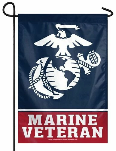 United States Marine Corps Veteran, Eagle, Globe, and Anchor insignia, printed polyester garden flag. The white EGA stands out sharply against the deep, blue background. The artwork is visible from both sides of the flag and the “Marine Veteran” lettering reads correctly from one side only. Fits on any garden flagpole. Flags size 12″ x 18″.